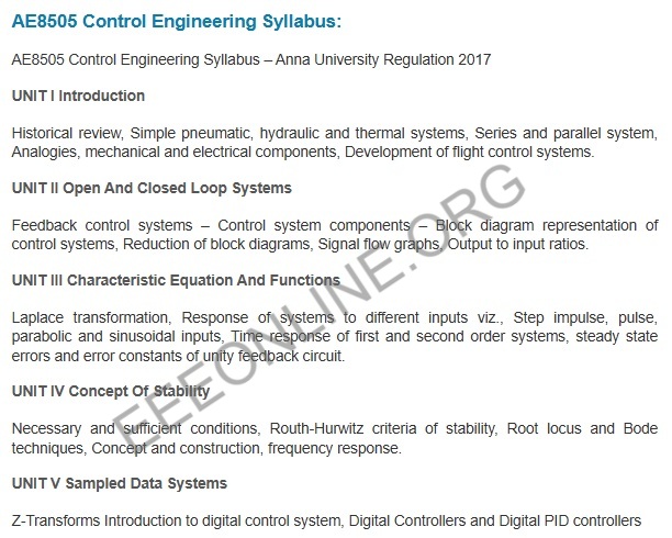AE8505 Control Engineering Syllabus – Anna University Regulation 2017